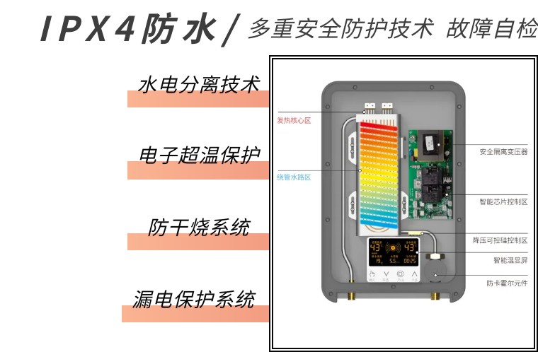 同時,機器還特設多重安全防護技術,搭載水電分離技術、電子超溫保護、防干燒系統、漏電保護系統等各項安全防護措施,用每一個貼心細節呵護你的沐浴安全。