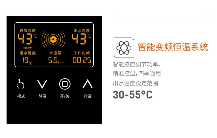 30-55℃寬域調溫,配合智能數顯面板,實時可見水流量和進出水溫變化,有效控制出水溫度,給家人帶來一年365天的溫暖舒適熱水。