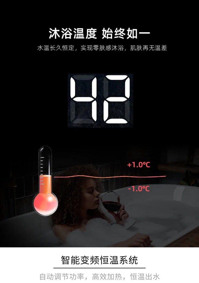 選擇熱水器,水溫不穩乃大忌。飛羽快熱即熱式熱水器,通過智能變頻恒溫系統,智能芯片隨時感應進出水溫度和水流量,自動調節加熱功率,實時調控水溫,解決溫度波動的問題,告別忽冷忽熱。