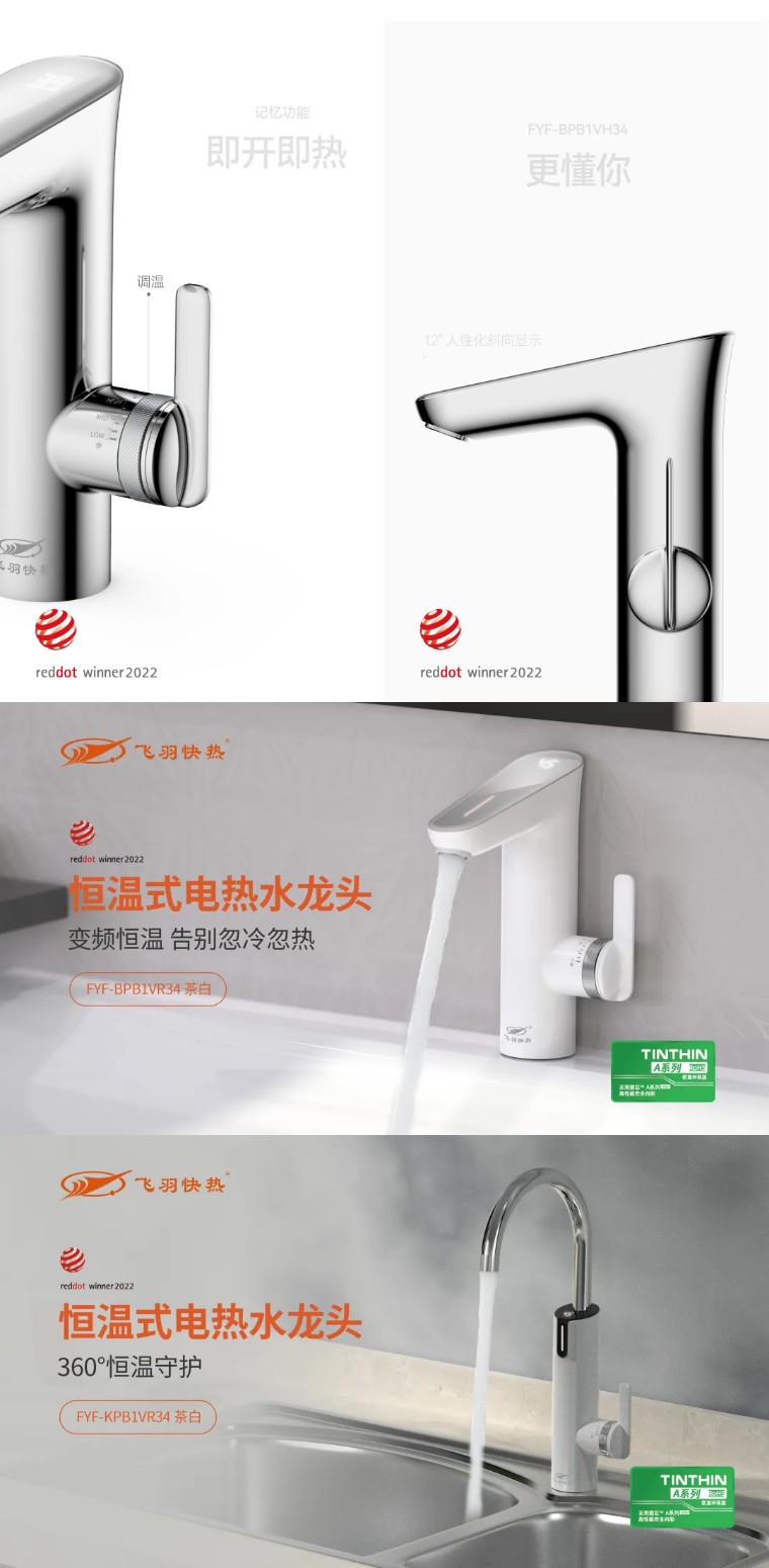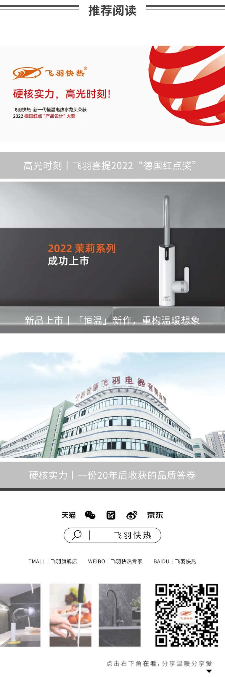 2022年新上市的恒溫電水龍頭·茉莉,搭載新一代霆芯A Series變頻恒溫安全內膽,解決了傳統電熱水龍頭使用時水溫忽冷忽熱的痛點,一鍵即刻獲取恒溫熱水,打造業內首款的“真恒溫”電熱水龍頭。該產品榮獲2022年德國紅點產品設計大獎,該獎項被譽為“設計界的奧斯卡”,也是全球公認的工業設計殿堂級獎項。
