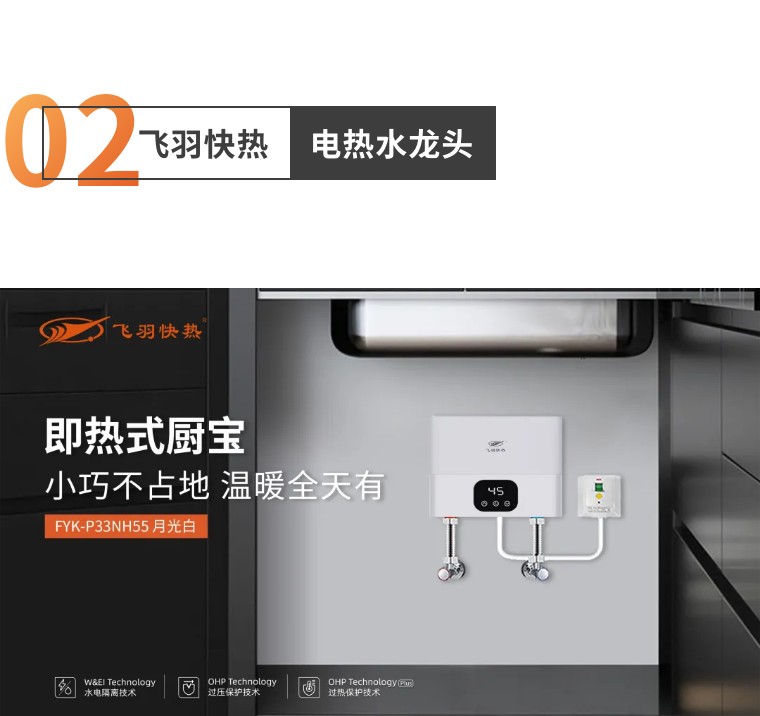 告別傳統熱水管傳輸的費時費水,飛羽快熱即熱式小廚寶熱水更快,也更省電,機身迷你小巧,使用場景靈活多變。無論在廚房、衛生間或者是陽臺,只要有冷水管和電源,小廚寶都可以提供源源不斷的熱水,方便人們隨時取用。