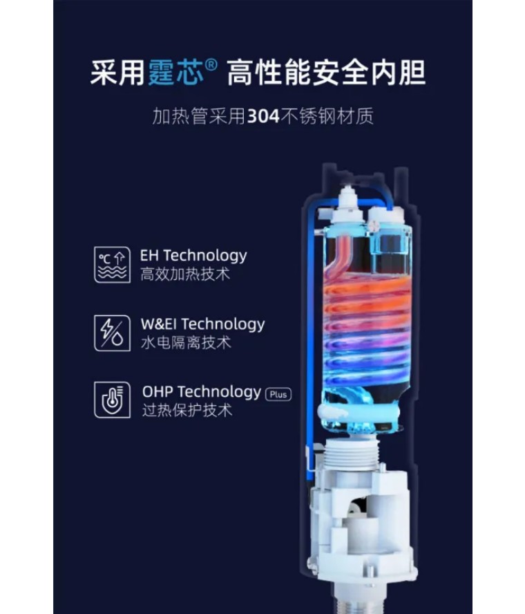 飛羽快熱電熱水龍頭,內部采用的是霆芯?高性能安全內膽,搭載高效加熱技術、水電分離技術和過熱保護技術。其中高效加熱技術,是通過創新式的加熱管設計,縮小容積以實現加熱提速。以45℃為例,采用霆芯內膽的電熱水龍頭與市售的傳統電熱水龍頭相比,升溫速度提升了25%(實驗數據源自寧波霆芯科技有限公司,僅供參考)。