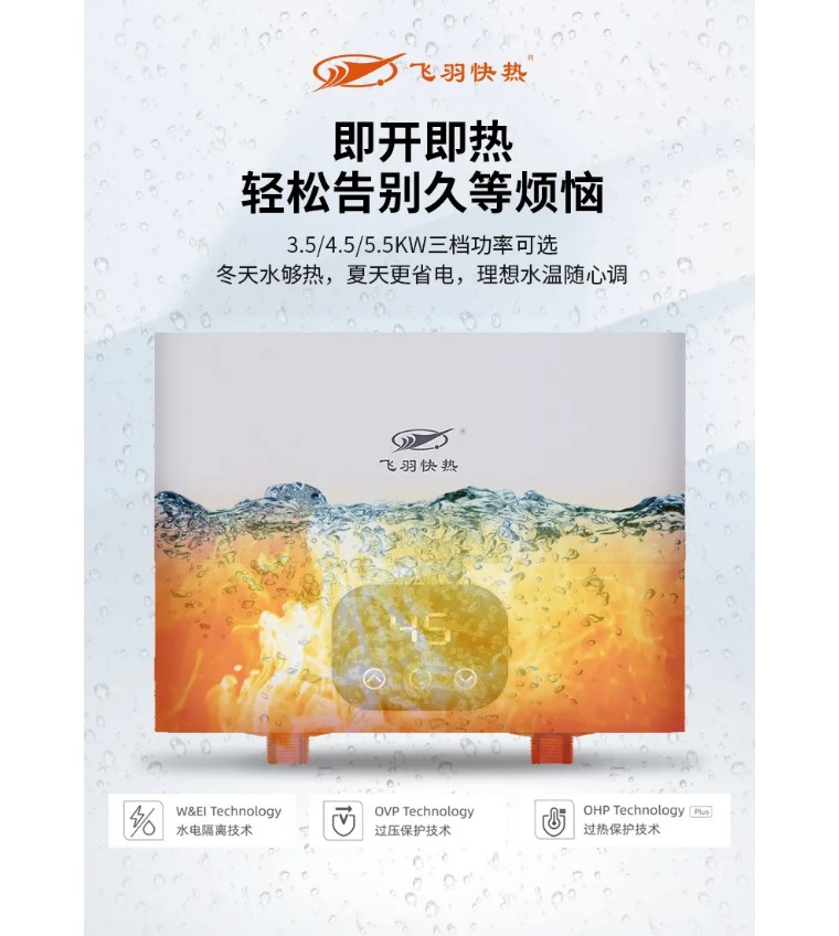 飛羽快熱即熱式電熱水器,告別傳統電熱水器的預熱模式和龐大體型,在體積和安裝上做到了大程度的精簡。輕薄機身搭配IPX4防水防濺,直接可以安裝在浴室里面,既不占空間又出熱水快,是現代城市生活的優質選擇。