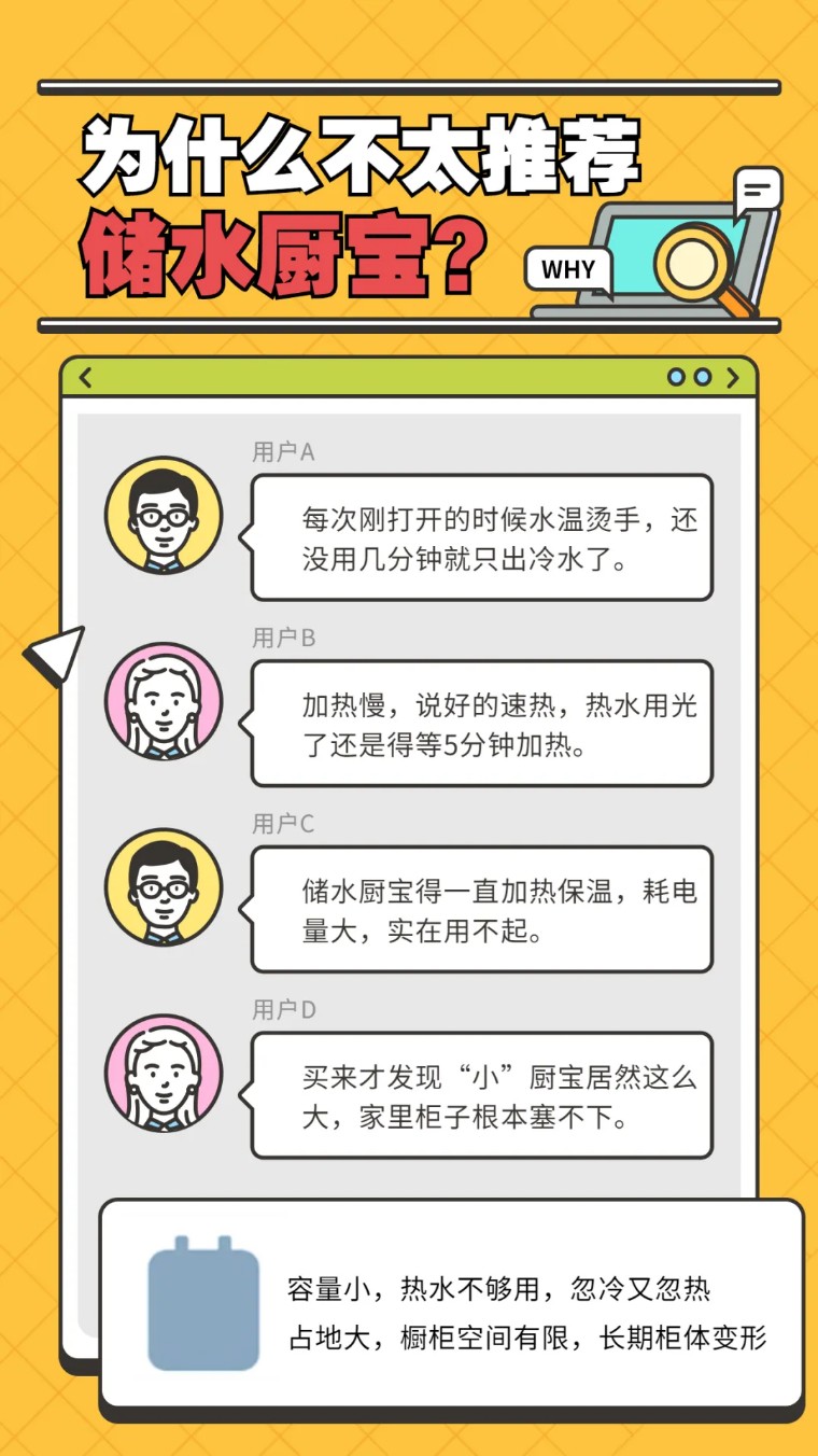 而且許多用戶使用后反饋,儲水式小廚寶的能耗很高,為了保持水溫,內膽里的水不斷被反復加熱,家里的電費都在蹭蹭蹭得上漲。長時間工作,機器的壽命也被縮減。