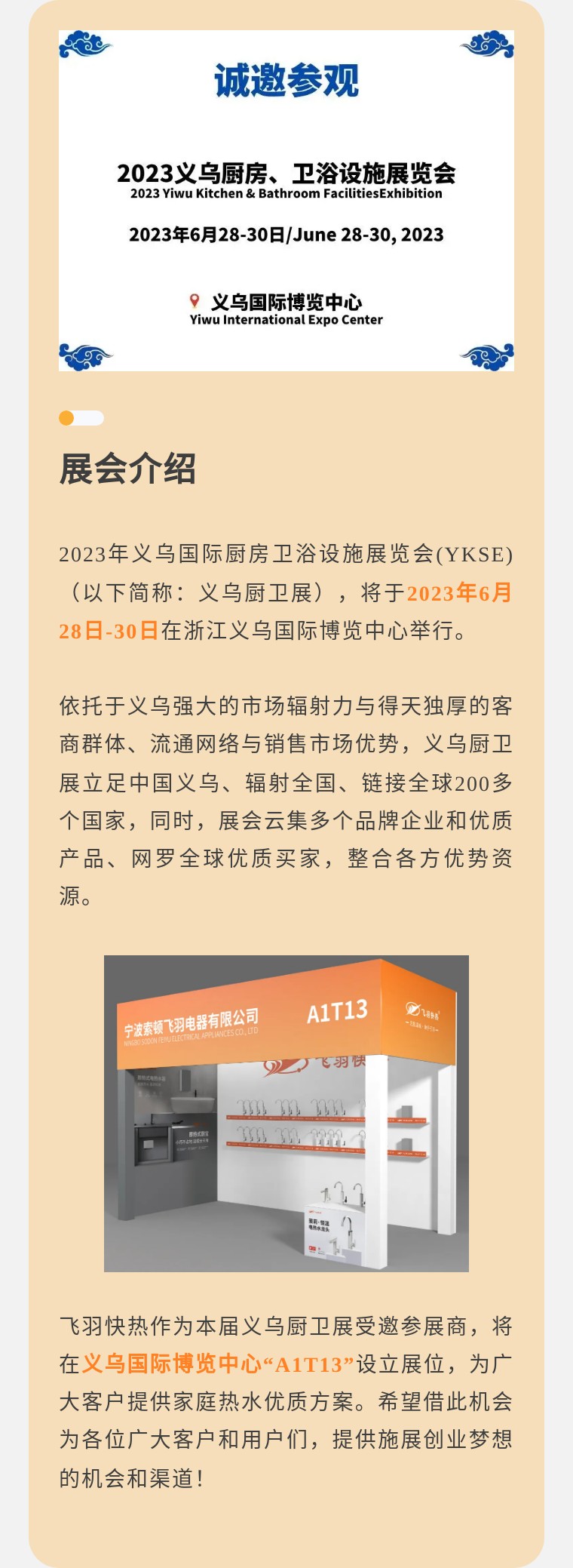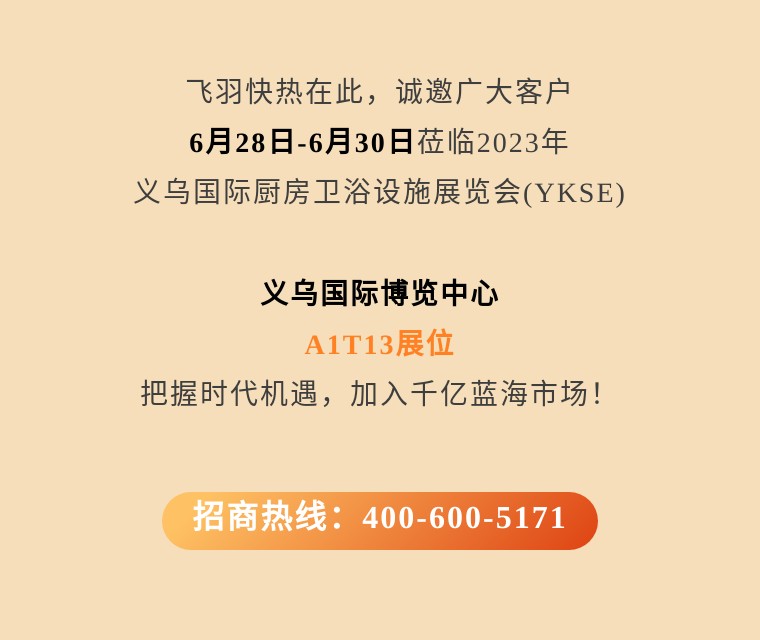 2023年義烏國際廚房衛(wèi)浴設(shè)施展覽會(YKSE)(以下簡稱:義烏廚衛(wèi)展),將于2023年6月28日-30日在浙江義烏國際博覽中心舉行。飛羽快熱作為本屆義烏廚衛(wèi)展受邀參展商,將在義烏國際博覽中心“A1T13”設(shè)立展位,為廣大客戶提供家庭熱水優(yōu)質(zhì)方案。希望借此機(jī)會為各位廣大客戶和用戶們,提供施展創(chuàng)業(yè)夢想的機(jī)會和渠道!